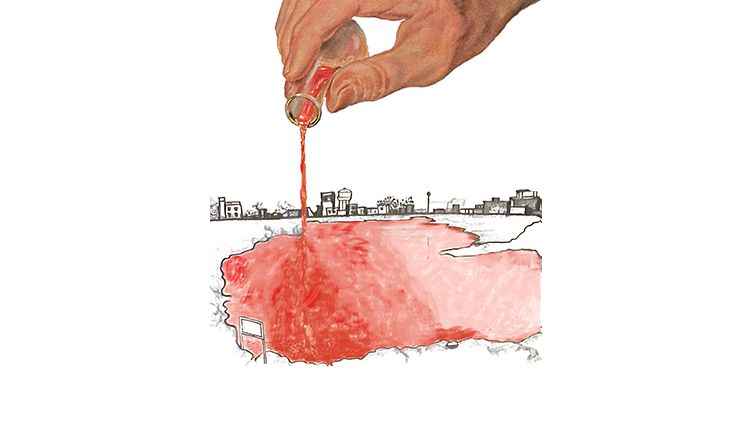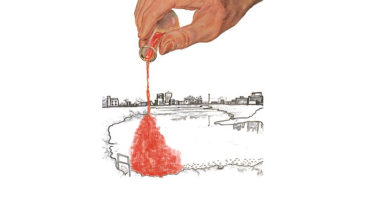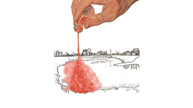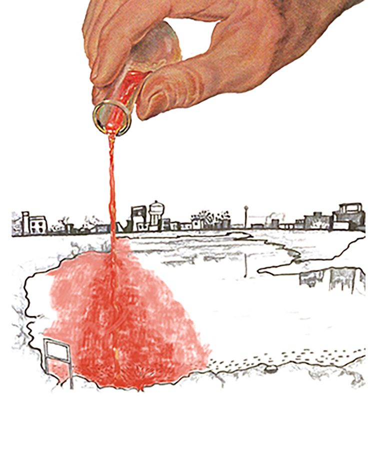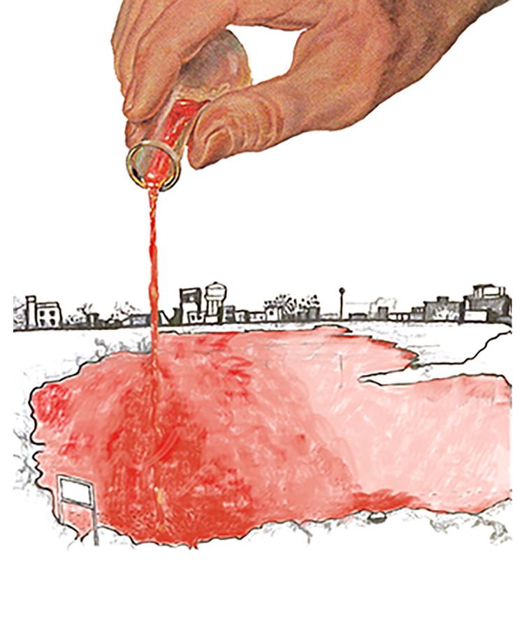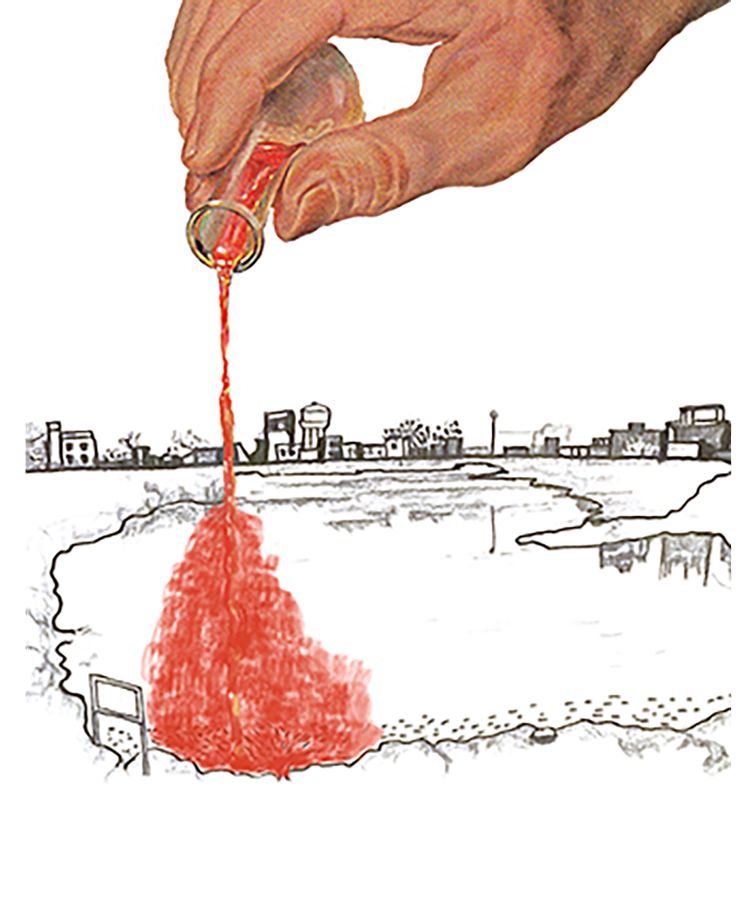 Steadily leaching from waste strewn about the abandoned factory, the damage the toxicants inflict is sometimes visible, eroding buckets, bowls, and pots, but is mostly unseen. Out of sight, it wreaks havoc on endocrine systems, invisibly breaches cells, corrodes bodily organs and twists genes. Even before they enter this world, it harms forever those soon to be born.